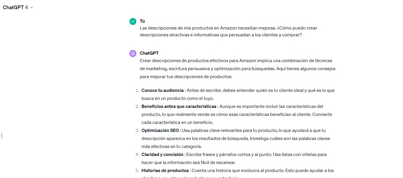 Hola os dejo este Prompts para modificar en tu chat GPT : Las descripciones de mis productos en Amazon necesitan mejoras. ¿Cómo puedo crear descripciones atractivas e informativas que persuadan a los clientes a comprar?